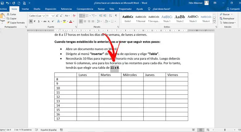 - Vous aurez besoin de 10 lignes pour entrer l’heure plus une pour le titre . Ensuite, vous devriez avoir 6 colonnes , une pour les horaires et le reste pour chaque jour. Par conséquent, vous devrez choisir une planche de 11 x 6 .
