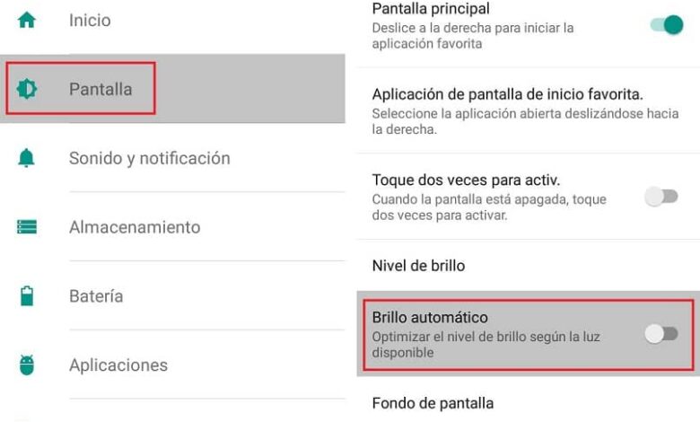 Une fois à l’intérieur, nous irons à la section qui dit «appareil» et nous choisirons l’option «écran», déjà sélectionné une fenêtre s’ouvrira où nous verrons les fonctions correspondant à l’écran, là nous ne désactiverons que l’option qui dit «luminosité automatique» et plus tard, nous redémarrerons l’appareil.