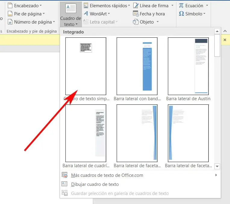 Eh bien, pour y parvenir, la première chose que nous devons faire est d’ajouter une nouvelle zone de texte à la position du document que nous voulons. C’est quelque chose que nous faisons via le menu «Insertion / zone de texte» de l’ interface principale de Word. Ici, dans la partie droite de la fenêtre, nous trouvons plusieurs types de boîtes, par exemple nous choisissons la «Zone de texte simple» la plus basique. Ainsi, une fois que nous avons cette zone de texte insérée dans le document, nous devons écrire le texte dont nous avons besoin.