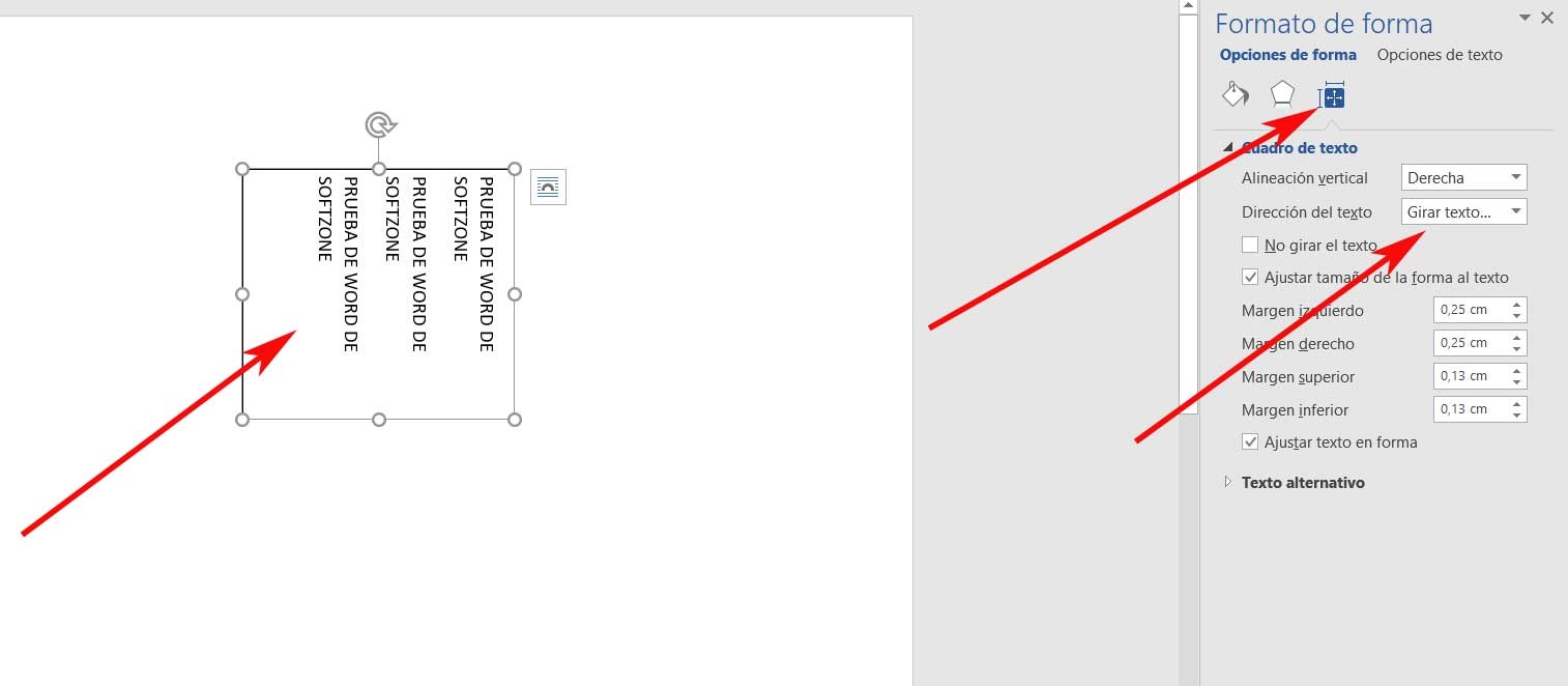 Au début, c’est quelque chose que nous effectuons de manière conventionnelle, c’est-à-dire horizontalement de gauche à droite. Une fois que nous avons écrit tout ce que nous voulons retourner, nous cliquons avec le bouton secondaire de la souris sur l’un des côtés de la boîte elle-même, nous sélectionnons donc l’option «Format de forme» dans le menu contextuel . Ainsi, dans la partie droite de la fenêtre, nous verrons qu’une nouvelle section apparaît avec différentes fonctions personnalisables.