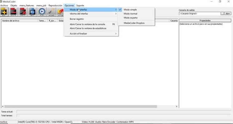 Une fois que nous exécutons MediaCoder pour la première fois, une interface chargée d’options apparaît, destinée principalement aux utilisateurs avancés . C’est pourquoi les plus récents dans le domaine peuvent être submergés par tant de fonctions. Pour ce faire, il nous permet de configurer le mode de son interface. Pour ce faire, en haut, nous trouvons les onglets de fonctions classiques, où il faut cliquer sur «Options». Plus tard, dans le «Mode Interface», nous choisissons entre «Simple», «Normal» et «Expert», selon nos connaissances. Par conséquent, pour les plus inexpérimentés, le meilleur est le mode Simple, qui se charge de masquer divers paramètres de réglage ou d’utiliser l’assistant de configuration.