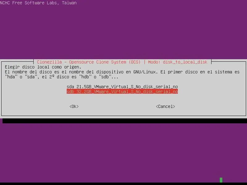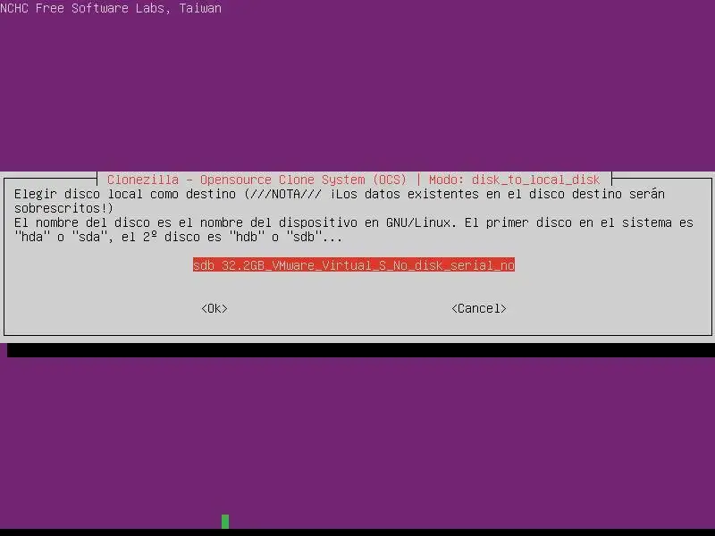 Et deuxièmement, le lecteur de destination , ou l’endroit où nous voulons copier les données. Nous devons nous assurer de bien choisir ce lecteur, car le processus effacera toutes les données sur le lecteur de destination afin d’y cloner le lecteur source.