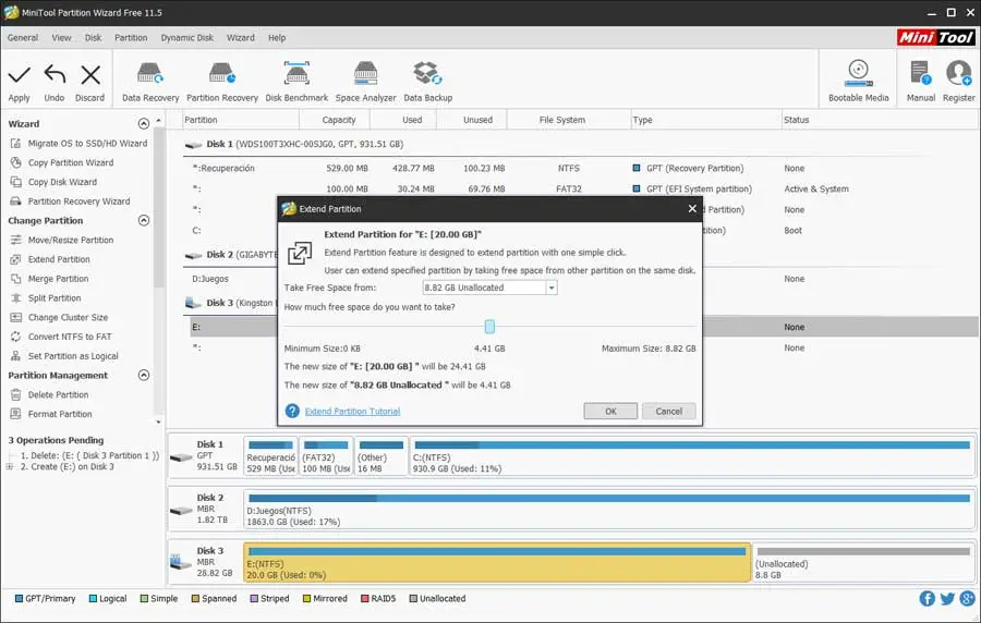 Pour cela, nous devons utiliser un gestionnaire de partition pour Windows qui nous permet de le faire. Par exemple, MiniTool Partition Wizard est un programme gratuit qui nous permettra, tant que l’espace est contigu, d’agrandir les partitions.