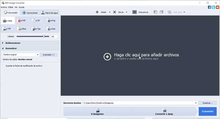 En haut à droite, nous trouvons trois onglets avec les principales fonctions de ce programme: Conversion, Corrections et Filigrane. Dans la partie centrale, nous trouvons le panneau principal où nous pouvons cliquer pour ajouter des fichiers ou les ajouter par glisser-déposer. En bas, nous trouvons le répertoire de destination , où seront enregistrés les fichiers résultant de notre conversion, ainsi que le bouton Convertir! que nous utiliserons pour convertir l’image une fois que nous aurons établi les paramètres appropriés.