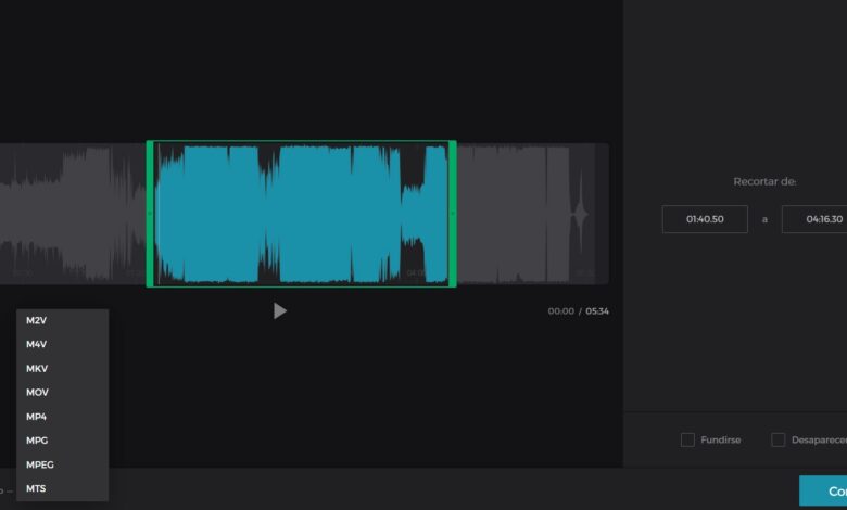 Ensuite, le fichier en question sera chargé sur la plateforme en tant que tel afin que nous puissions limiter directement la section que nous voulons extraire du signal audio affiché. C’est quelque chose que nous réalisons en faisant simplement glisser avec la souris le début et la fin de la section à couper du MP3 original. Également sur le côté droit de l’interface , nous verrons l’ exacte du temps où nous avons placé les deux limites afin d’être plus précis.