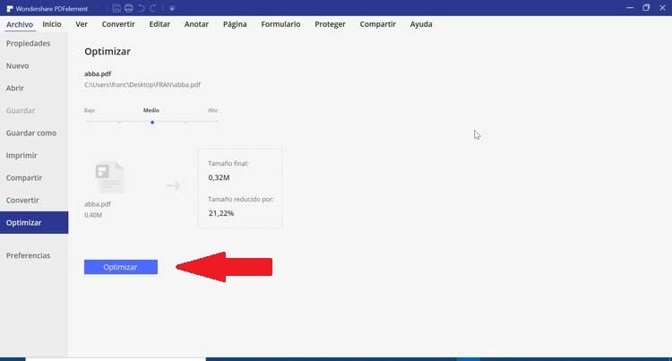Si nous utilisons la fonction Optimiser le PDF , réduisez la taille de tout fichier PDF, afin qu’il prenne moins d’espace tout en conservant toutes les informations qu’il contient intactes. La conversion peut être faible, moyenne ou élevée. A tout moment il nous montre la taille finale, ainsi que le pourcentage de diminution de poids en fonction du type de conversion choisi.