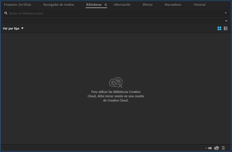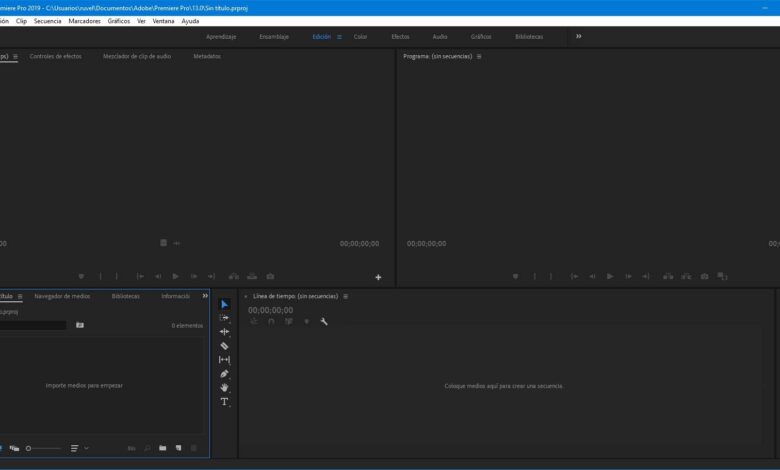 La fenêtre Adobe Premiere, lorsque nous avons créé un nouveau projet, apparaîtra comme suit. Comme on peut le voir, nous avons sélectionné l’espace de travail d’édition, car c’est le plus courant et dans lequel nous travaillerons la plupart du temps.