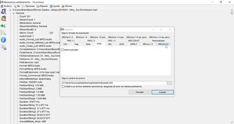 MediaInfo est un programme gratuit qui nous permet d’accéder et de visualiser toutes les métadonnées contenues dans nos fichiers audio et vidéo. Cette application se chargera d’afficher toutes ces informations de différentes manières, par exemple dans une simple feuille, en texte brut, en arborescence, au format HTML, etc. De plus, il est possible d’exporter les données au format CVS, HTML ou TXT. De plus, il peut être exécuté via l’interface graphique, la ligne de commande ou la DLL.