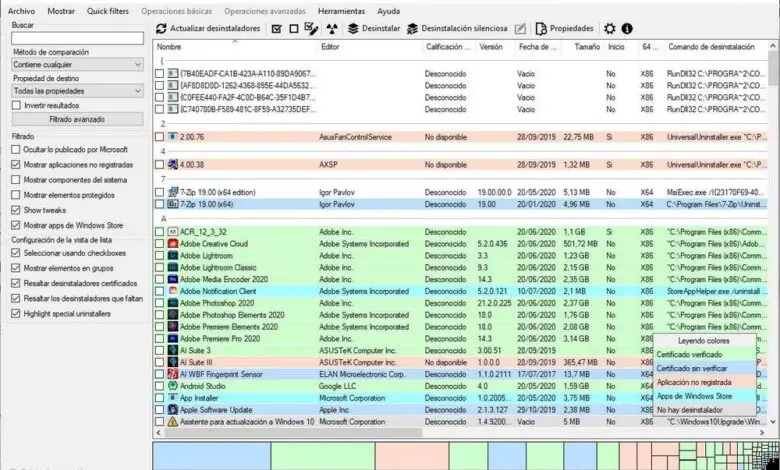 Dans celui-ci, nous pourrons voir une liste de tous les programmes que nous avons installés sur le PC. Cette liste aura une légende de couleur qui nous permettra de connaître le type de programme de désinstallation de chaque programme. Les verts, par exemple, sont des programmes de désinstallation vérifiés, les bleus foncés sont ceux qui ont un certificat non vérifié, les roses sont une application non enregistrée dans le système, les bleu clair sont des programmes du Microsoft Store et les gris clair sont tous ces programmes qui n’ont pas de programme de désinstallation.