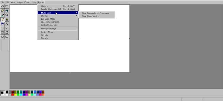Pour commencer à utiliser JSPaint, il suffit de cliquer sur le lien suivant et son interface reconnaissable apparaîtra instantanément sur notre ordinateur sans rien télécharger. Comme on peut le voir, il garde tous ses outils sur le côté gauche, les couleurs sont toujours présentes dans la partie inférieure, au centre on trouve la toile sur laquelle on peut dessiner et dans la partie supérieure il y a la barre d’outils classique organisée par onglets . On y trouve les sections «Fichier», «Edition», «Affichage», «Image», «Couleurs», «Aide» et «Extras». Si on clique sur chacun d’eux, ses différentes fonctions apparaissent affichées. Bien sûr, tout est en anglais , car, pour le moment, il n’y a pas de traduction en espagnol.