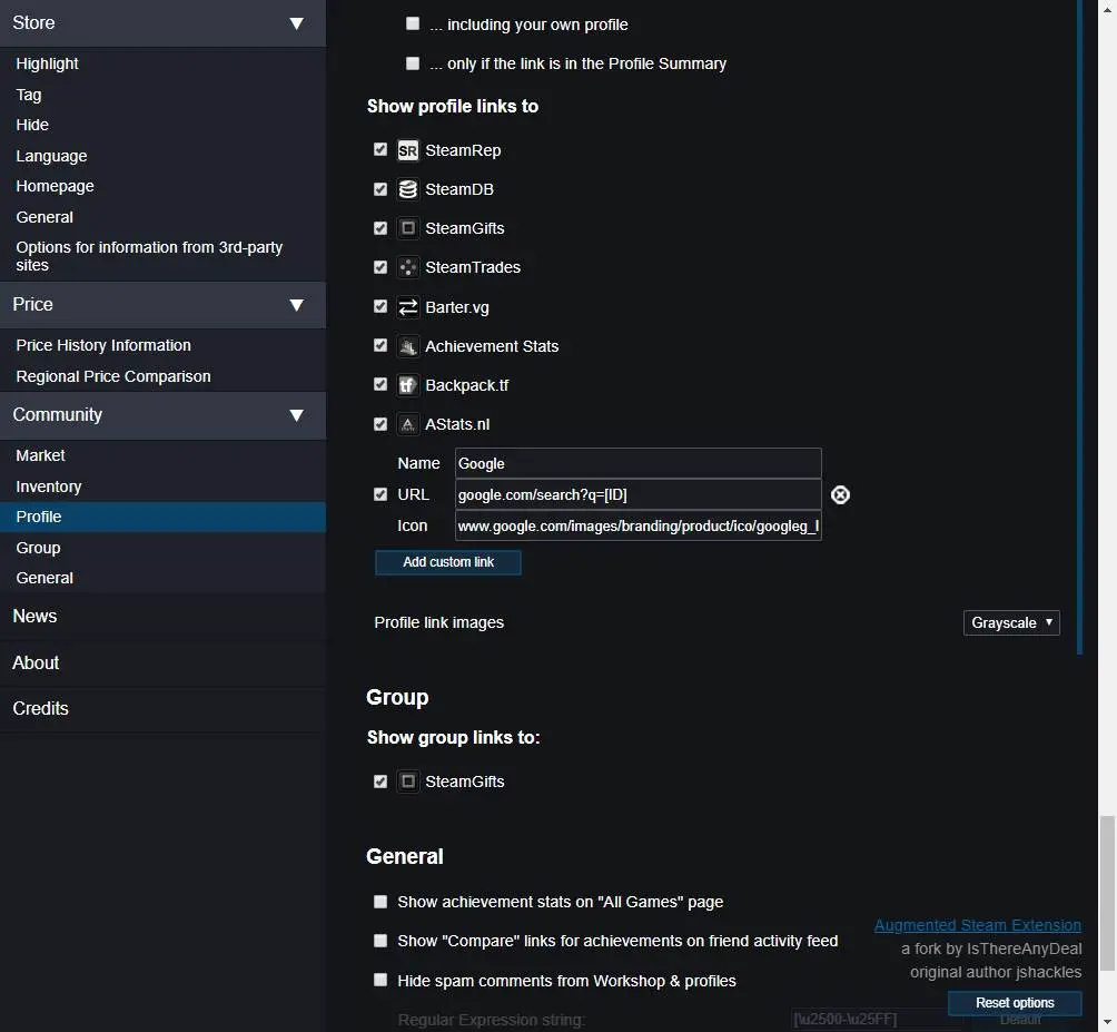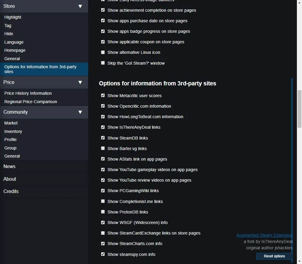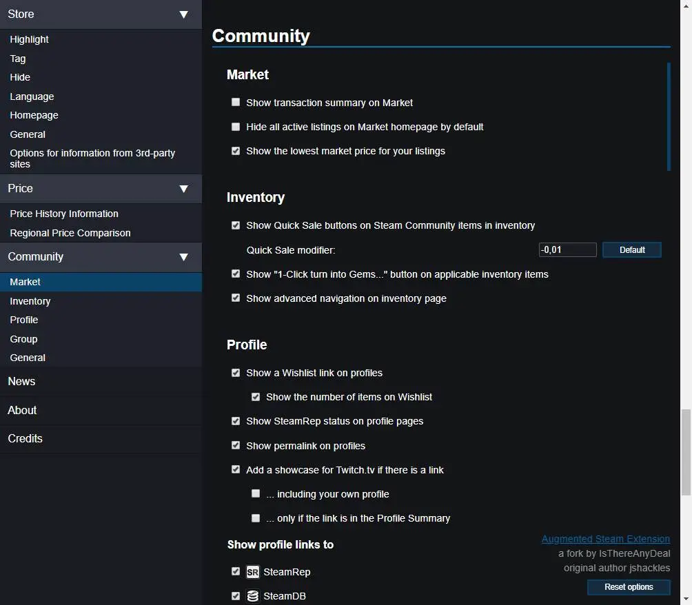 Et enfin, la section «Communauté» nous permet d’ajuster certaines fonctions et fonctionnalités de Steam Market, notre inventaire et la communauté. Le plus intéressant est qu’il se connecte à des plates-formes telles que SteamDB pour nous permettre de voir des informations beaucoup plus détaillées sur notre profil.