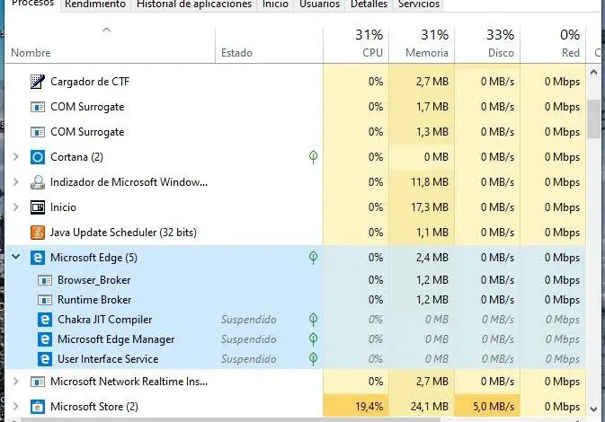 Nous pouvons voir que dès que nous allumons l’ordinateur, dans la liste des processus que nous avons dans l’outil «Gestionnaire de tâches», le processus Edge apparaît en cours d’exécution en arrière-plan et avec ses threads correspondants.