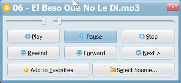 En haut de la fenêtre, nous trouvons deux lignes. Celui de gauche est l’indicateur de volume, tandis que celui de droite sert à avancer ou reculer la chanson à notre goût. Nous trouvons également un soi-disant Select Source à partir duquel nous pouvons choisir un autre répertoire à partir duquel nous avons plus de fichiers que nous voulons écouter. Juste à côté, nous trouverons l’option Ajouter aux favoris , où nous pouvons ajouter la chanson que nous écoutons à nos favoris. Toutes les chansons que nous marquons comme favorites peuvent être exportées vers un fichier texte .txt.