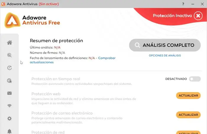 Une fois que nous avons exécuté Adaware Antivirus, le menu principal apparaît , entièrement en espagnol avec une interface simple et claire. Dans le menu Démarrer, nous pouvons voir un résumé de la protection avec la dernière analyse effectuée et différentes méthodes de protection telles que: Protection en temps réel, protection Web, protection des e-mails, protection du réseau, etc.