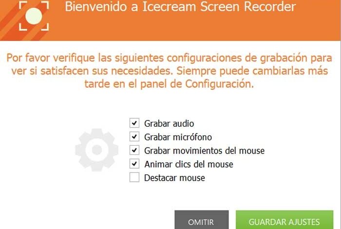 Une fois que nous exécutons l’application pour la première fois, une fenêtre apparaît dans laquelle nous devons vérifier les conditions d’enregistrement , et que nous pouvons modifier ultérieurement à partir du menu Paramètres. De cette façon, nous pouvons marquer si nous voulons que l’enregistrement audio, le microphone, l’enregistrement des mouvements de la souris soient actifs, animer les animations de la souris et mettre en évidence la souris. Nous sélectionnons ceux dont nous avons besoin et cliquons sur «Enregistrer les paramètres». Si nous ne voulons pas le personnaliser, cliquez simplement sur «Ignorer».