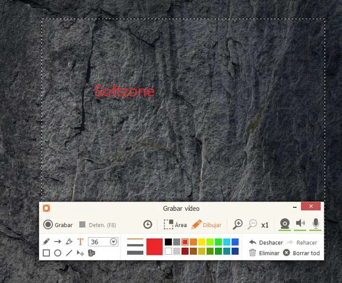 Lors de l’enregistrement de nos captures vidéo, nous pouvons choisir si nous voulons le faire en plein écran , sélectionner une zone spécifique, détecter automatiquement la zone d’enregistrement et ajouter des tâches. Si nous voulons sélectionner une zone spécifique pour l’enregistrement, nous devons sélectionner une zone, le programme nous montrant les dimensions de la même que nous pouvons personnaliser à notre goût. Il nous permet également de dessiner sur la zone d’enregistrement , de faire un zoom avant ou arrière sur l’image, ainsi que d’activer ou de désactiver la webcam, l’audio et le microphone.