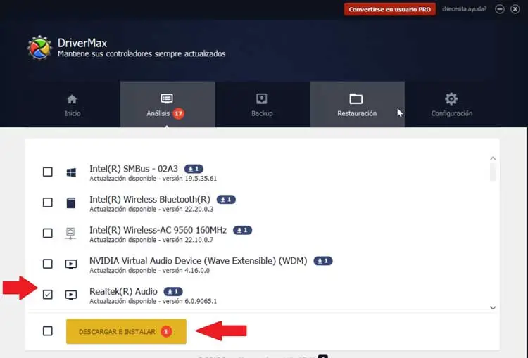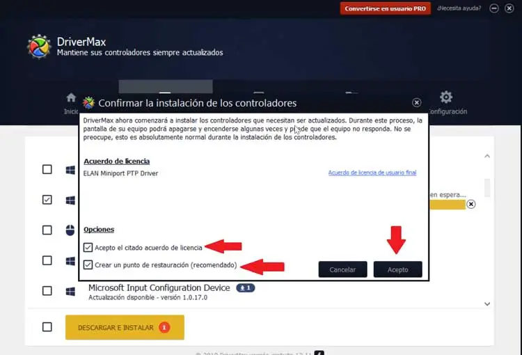 Une fois que nous avons sélectionné les pilotes que nous voulons mettre à jour et cliquez sur le bouton «Télécharger et installer» que nous trouvons en bas. Si nous avons la version PRO, nous pouvons tous les sélectionner, si nous le souhaitons, et les mettre à jour immédiatement. Une fois que nous avons cliqué, une barre de téléchargement apparaîtra sur la droite où nous pouvons voir la progression jusqu’à la fin. Quand il a été téléchargé, une nouvelle fenêtre apparaîtra indiquant que les pilotes seront installés. Nous devrons accepter le contrat de licence et il recommande de créer un point de restauration . Cliquez sur «J’accepte» pour commencer l’installation.