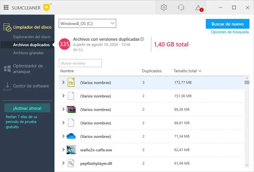 Il existe deux autres options pour nettoyer l’espace disque. Slimcleaner peut vous montrer les fichiers que vous avez en double et, dans une autre fenêtre, ceux qui occupent le plus d’espace sur votre unité de stockage. Les deux options sont très utiles. D’une part, ils nous permettent de supprimer des fichiers que nous possédons déjà et, d’autre part, ils libèrent une grande quantité d’espace en un clic.