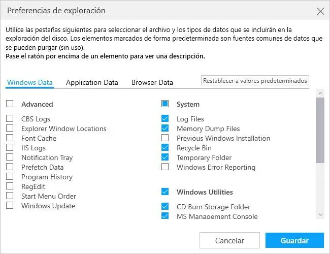 Slimcleaner propose d’explorer l’espace disque à travers trois facteurs. Le premier, détecter et éliminer les données de Windows, d’autres programmes et du navigateur. Le programme classera les fichiers à supprimer, ainsi que leur nom et leur taille. Il est possible d’ajuster cette exploration à vos intérêts si vous sélectionnez «préférences d’exploration».