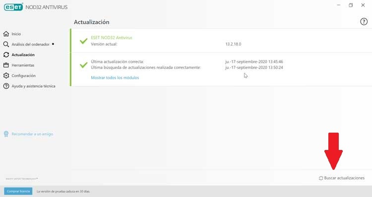 Para ello, desde el menú principal de nuestro antivirus ESET debemos pulsar en el botón de «Actualizar» que se encuentra situado en la barra de tareas de la izquierda. Una vez pulsado nos aparecerá una nueva ventana donde debemos de pulsar en el botón de «Buscar actualizaciones», situado en la parte inferior derecha. A continuación, el programa se encargará de buscar cualquier versión más reciente, y en caso de que se encuentra se actualizará de manera automática. En la parte superior encontraremos la versión actual de nuestro antivirus, así como la última actualización correcta.