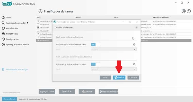 Pulsamos en «Siguiente» y en la última ventana deberemos seleccionar el perfil con el que vamos a realizar la tarea, en caso de que dispongamos de más y pulsaremos en «Finalizar». Una vez pulsado comprobaremos en el planificador de tareas como se ha añadido nuestra nueva tarea de actualización programada.
