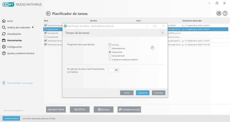 En la siguiente pantalla deberemos de cada cuanto tiempo queremos que se ejecute la tarea: «Una vez», «Reiteradamente», «Diariamente», «Semanalmente» o «Cuando se cumpla la condición». También nos permite marcar una casilla para no ejecutar la tarea si nuestro ordenador está funcionando en ese momento con batería. Pulsamos en «Siguiente», y ahora nos tocará indicar a qué hora queremos que se ejecute la tarea.