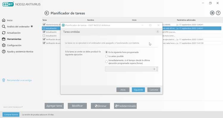 Posteriormente, en la siguiente ventana nos aparecerá las tareas omitidas. Por lo general, la tarea no se llevará a cabo si el ordenador está apagado o funcionando con batería, por lo que debemos indicar cuándo realizar la siguiente ejecución: «En la siguiente hora programada», «Lo antes posible» o «Inmediatamente», si el tiempo desde la última ejecución programada supera el límite horas que establezcamos.