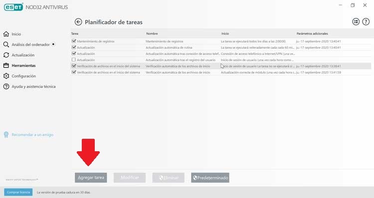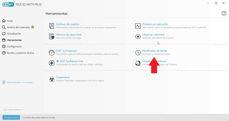 Por ello si queremos crear una tarea de actualización, debemos de pulsar en el apartado de «Herramientas» que encontraremos en la barra de tareas dentro del menú principal de nuestro antivirus ESET. Una vez pulsado, nos aparecerá otra pantalla donde debemos de pulsar sobre la función de «Planificador de tareas».