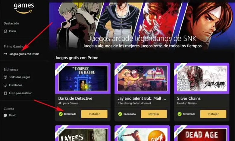 Tout d’abord, la première chose à savoir est que nous pouvons télécharger le client commenté à partir de ce lien . Ensuite, il nous suffit de saisir les informations d’identification de notre compte Amazon pour accéder à notre nom d’utilisateur personnel. Ainsi, une fois que nous démarrons le logiciel, nous trouvons une section intitulée Jeux gratuits avec Prime. Ici, nous pouvons cliquer sur Réclamer pour que les titres qui sont donnés deviennent une partie de notre bibliothèque .