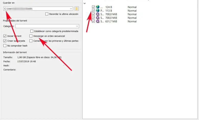 Par contre, si le torrent en question est composé de plusieurs fichiers à l’intérieur, ce qui est assez fréquent, dans le panneau central, nous pouvons choisir ceux que nous voulons télécharger. Cela signifiera un gain de temps important, car dans de nombreux cas, nous n’aurons pas besoin de télécharger tout le contenu d’un torrent. Par conséquent, de cette manière, nous ne pouvons sélectionner que les parties que nous devons vraiment enregistrer sur le disque dur localement.