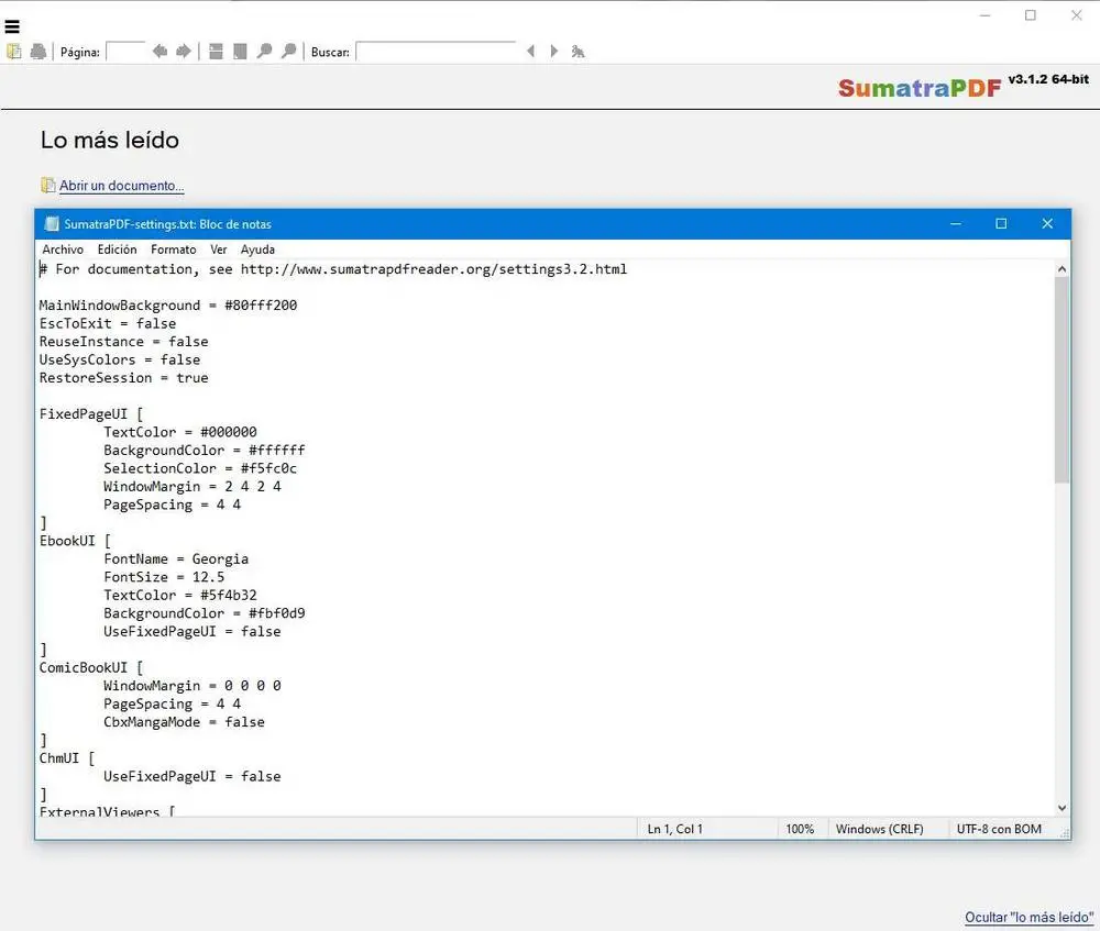 De toutes les options de ce menu, nous pouvons mettre en évidence les (quelques) options de configuration qu’il nous offre. Nous pouvons configurer certains aspects de l’affichage du programme, en plus de choisir si nous voulons qu’il recherche automatiquement des mises à jour ou autorise l’utilisation d’onglets pour ouvrir plusieurs documents dans la même fenêtre. Nous pouvons également accéder à la configuration avancée, bien que celle-ci doive être modifiée directement à partir d’un txt.