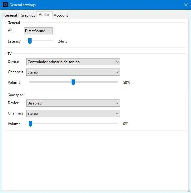 - Audio: nous permet de configurer tout ce qui concerne l’audio, de l’API et de la latence, aux périphériques de sortie audio, à la fois pour la console et le contrôleur.
