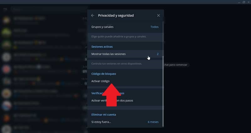 Pour protéger notre compte avec un mot de passe, il faut cliquer sur «Paramètres» (trois bandes horizontales en haut à gauche) et cliquer sur «Paramètres». Maintenant, nous devons sélectionner «Confidentialité et sécurité». Ensuite, un menu apparaîtra et nous devrons faire défiler vers le bas jusqu’à trouver la section «Code de verrouillage» et cliquer sur «Activer le code» pour entrer notre mot de passe . En cas d’oubli, il sera nécessaire de fermer l’application Telegram Desktop et de se reconnecter.