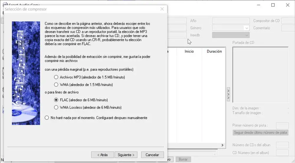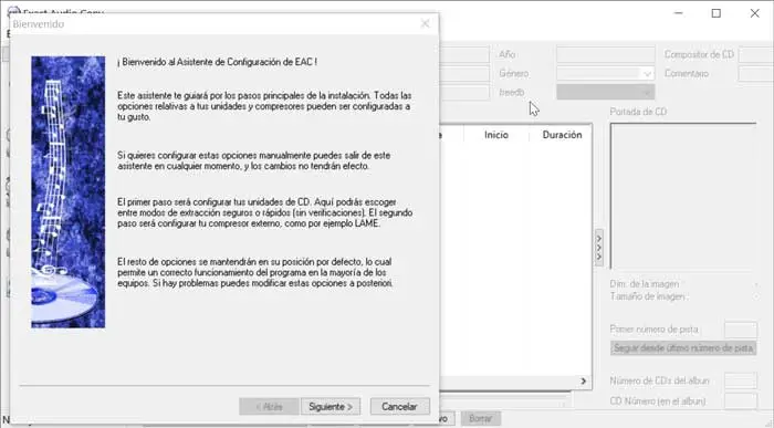 Une fois installé, nous le démarrons et un écran apparaîtra avec un assistant, qui vous guidera lors de la configuration du programme, en pouvant choisir le lecteur CD et la qualité de la qualité audio. Comme nous allons avoir besoin de la meilleure qualité, nous devons choisir le format FLAC pour continuer.