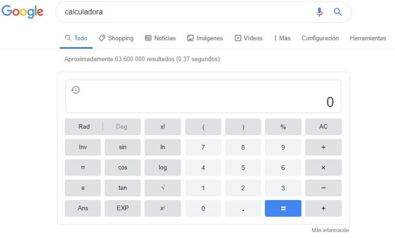 Évidemment, nous ne pouvions pas commencer à parler de calculatrices en ligne sans parler de Google. Le géant a une application cachée dans son moteur de recherche qui nous permet d’activer une calculatrice. Si vous écrivez «calculatrice» dans la barre de recherche, nous pouvons lancer cette application pour faire nos comptes.