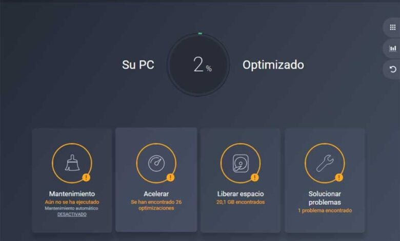 Comme vous pouvez le voir de première main dès que vous accédez à ce logiciel , après son installation, nous voyons un total de quatre raccourcis vers les fonctionnalités. Plus précisément et pour nous donner une idée, nous verrons ici un contrôle de maintenance, un autre appelé Accélérer, libérer de l’espace et dépanner.