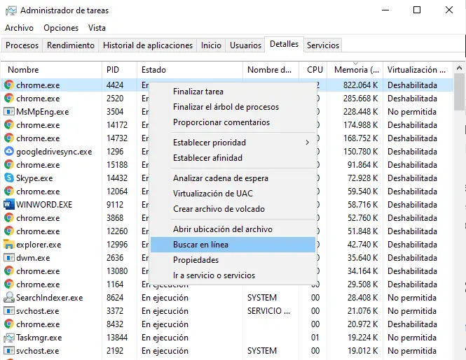 Par conséquent, comment supprimer un virus ou un malware ? Tout n’est pas si négatif. Nous pouvons garder notre ordinateur propre si nous passons de temps en temps à vérifier qu’il est exempt de logiciels malveillants. Pour cela, nous allons devoir ouvrir le «Gestionnaire des tâches», nous pouvons le faire en faisant un clic droit sur la barre des tâches de Windows ou en appuyant sur «Ctrl + Maj + Echap».