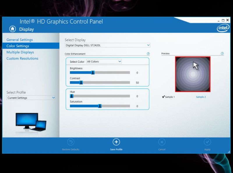Les graphiques de l’écran sont gérés par la carte graphique intégrée. Et généralement, il s’agit d’une puce Intel. Maintenant, ouvrez les paramètres Intel Graphics et allez dans l’onglet «Affichage». De même, recherchez les paramètres de couleur ou quelque chose de similaire.