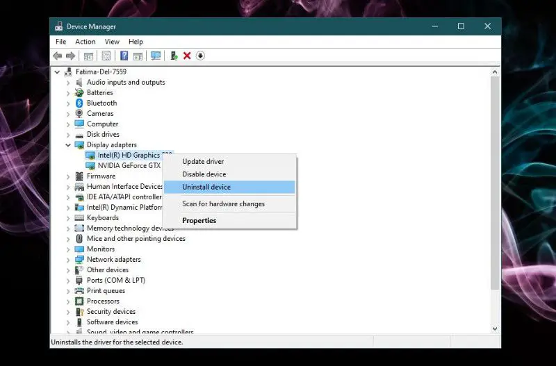 Il est préférable de le faire en mode sans échec car il s’exécute en mode graphique faible par défaut. Ouvrez le Gestionnaire de périphériques et recherchez «Cartes graphiques». Maintenant, développez et faites un clic droit sur la carte graphique intégrée. Maintenant, sélectionnez «Désinstaller l’appareil». Redémarrez votre PC et le pilote graphique devrait s’installer à nouveau.