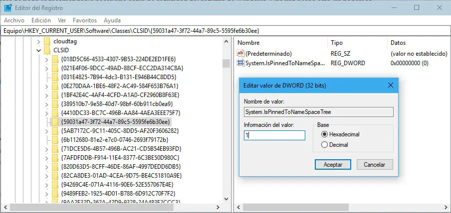 Par conséquent, il est tout d’abord conseillé de faire une copie de sauvegarde du registre Windows. Une fois que cela est fait, nous pouvons entrer à nouveau dans le registre en exécutant la commande regedit à partir de la fenêtre d’exécution de Windows, Win + R, et accéder au chemin HKEY_CURRENT_USERSOFTWAREClassesCLSID {59031a47-3f72-44a7-89c5-5595fe6b30ee} si nous avons un système 32 bits , ou au chemin HKEY_CURRENT_USERSOFTWAREClassesWow6432nodeCLSID {59031a47-3f72-44a7-89c5-5595fe6b30ee} si notre ordinateur est 64 bits.