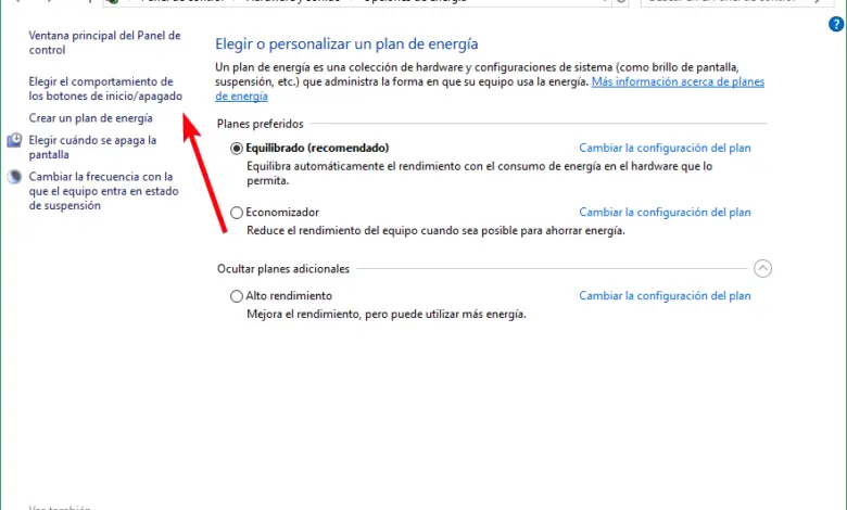 Depuis cette nouvelle fenêtre, nous pouvons configurer toutes les options de comportement et de fonctionnement des boutons de l’ordinateur. Dans notre cas, ce que nous voulons faire, c’est que le bouton d’alimentation nous permette d’éteindre l’écran en appuyant dessus au lieu d’éteindre tout l’ordinateur.