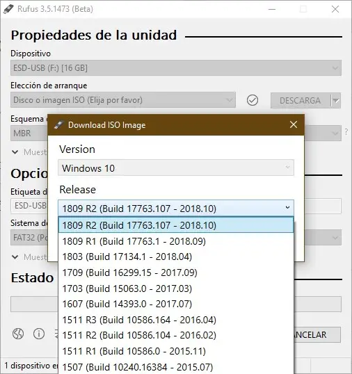 Désormais, la création d’une installation USB Windows 10 avec Rufus 3.5 sera beaucoup plus rapide et directe grâce au fait que les développeurs ont inclus une nouvelle option qui nous permet de télécharger Windows 10 (et Windows 8.1) directement depuis le programme, le les dernières versions également, nous n’aurons donc plus à le chercher par d’autres moyens.
