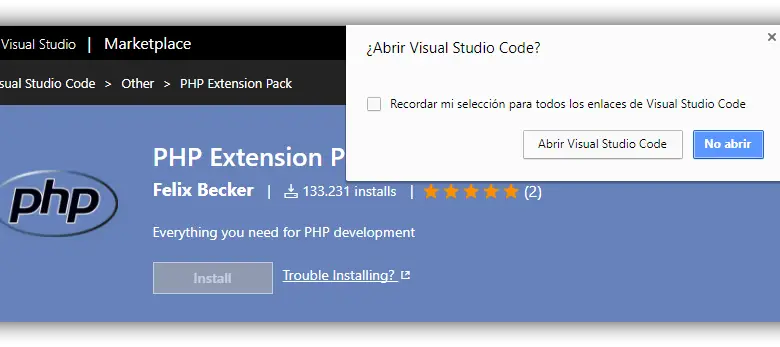 Une fois à l’intérieur du magasin, il suffit de chercher l’extension que nous allons utiliser puis de cliquer sur le bouton «Installer». Le Web essaiera d’ouvrir l’éditeur de texte pour procéder à l’installation automatique de l’extension, donc si nous n’avons pas encore installé VSC, nous devrons l’installer avant d’installer les extensions.