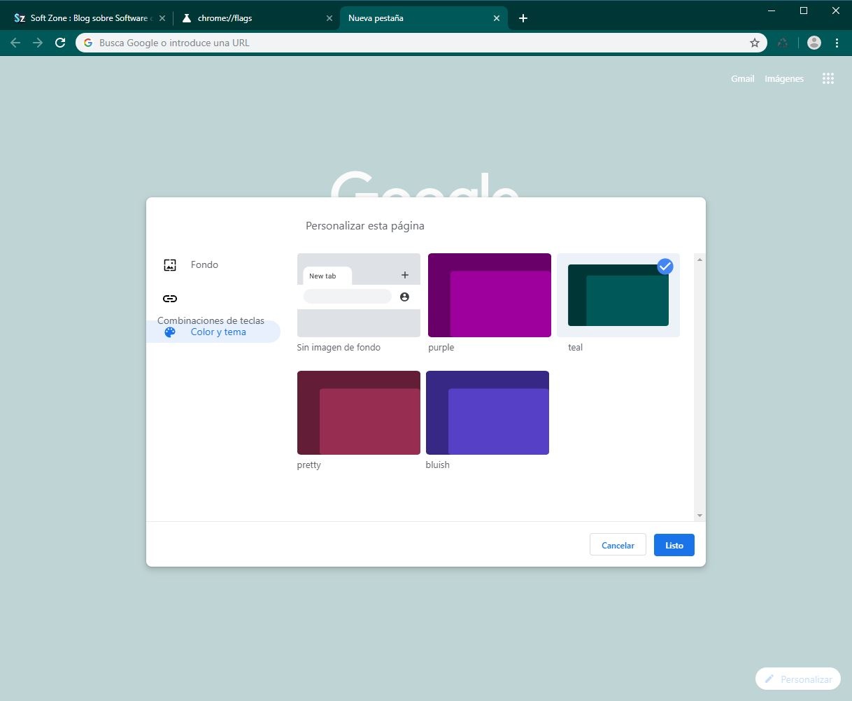 Enfin, l’option de personnalisation la plus intéressante est « Couleur et thème ». Cette option nous permet de configurer un arrière-plan coloré sur la page d’accueil de Google Chrome et, en plus, elle attribuera un thème de couleur au reste du navigateur afin que tout soit en parfait accord.