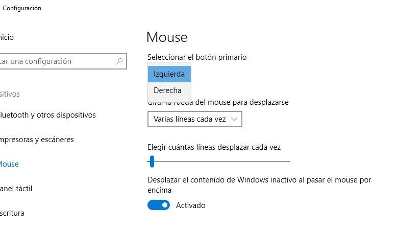 Si le problème persiste, l’étape suivante consiste à vérifier que la souris est correctement configurée. Pour ce faire, nous devons ouvrir la page Paramètres de Windows 10 et accéder à l’option Périphériques> Souris ou Souris . Une fois sur place, nous devons vérifier que le bouton principal de la souris est configuré pour être le bouton gauche. Sinon, nous devons afficher les options de paramétrage et sélectionner le bouton gauche comme bouton principal de la souris.