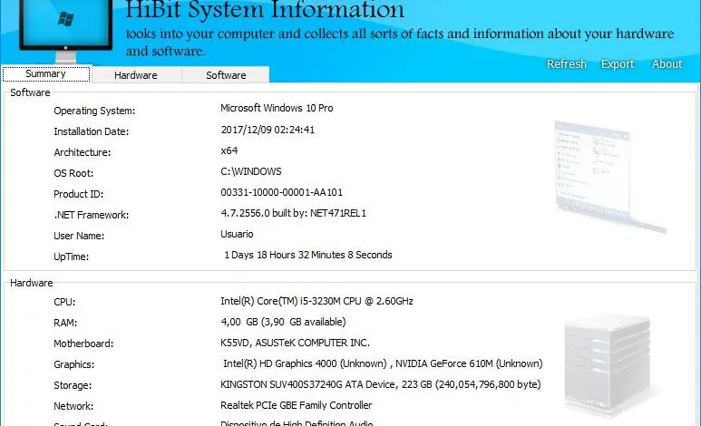 Une fois que nous avons lancé l’application, HiBit System Information commencera à collecter toutes les informations de notre ordinateur et plus tard, il nous montrera toutes dans son interface organisée par onglets. Dans l’onglet récapitulatif, nous pouvons voir des informations générales sur notre ordinateur, processeur, carte graphique, disque dur, carte réseau et certains détails logiciels, tels que la version du système d’exploitation installé sur l’ordinateur ou son architecture, etc.