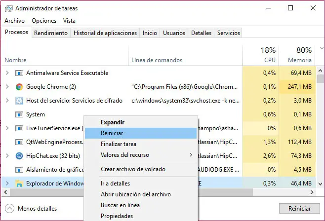 Para tratar de solucionar este problema podemos reiniciar el explorador de Windows 10 y comprobar si después de esto el problema se resuelve o continúa. Para ello, simplemente tenemos que abrir el administrador de tareas del sistema, Ctrl + Mayúsculas + Escape, y desde la lista de procesos buscamos el Explorador de Windows para hacer clic sobre él con el botón derecho para seleccionar la opción Reiniciar.