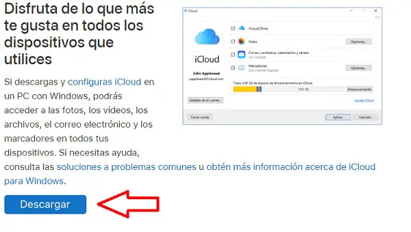 Si nous voulons télécharger toutes nos photos sur notre ordinateur d’un seul coup, nous devons télécharger l’application iCloud pour Windows depuis le site officiel. C’est super simple, il vous suffit de cliquer sur le bouton bleu décrit comme «Télécharger» , une fois terminé, nous pouvons l’installer.