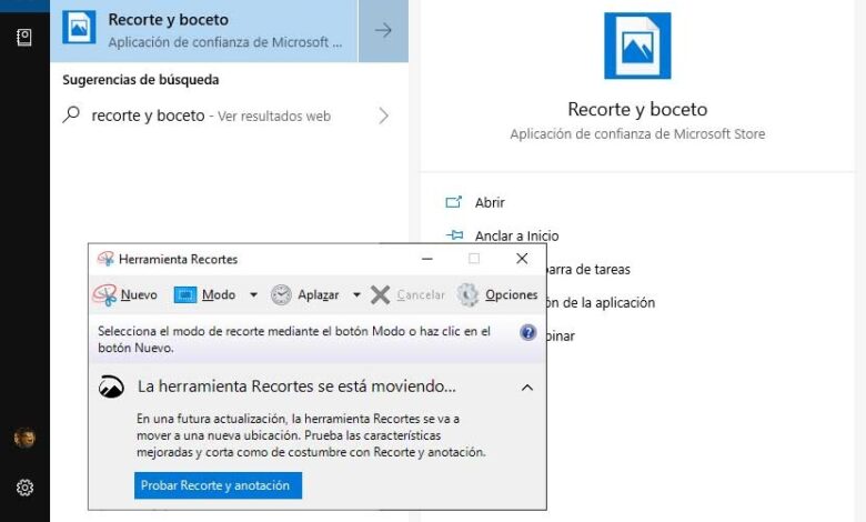 Par conséquent, pour ouvrir Snip & Sketch , il suffit de saisir son nom dans la zone de recherche de la barre des tâches. Il faut dire que si nous ouvrons le Snipping Tool actuel, il nous montrera un message accompagné d’un bouton qui nous permet d’ouvrir la nouvelle application.