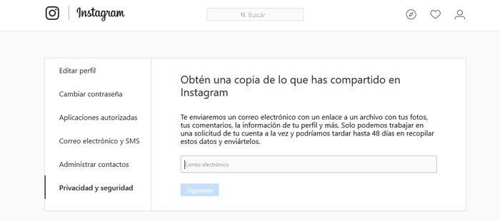 Dites qu’il s’agit pour le moment d’une fonctionnalité disponible dans l’ application Web Instagram, il est donc prévu qu’il ne faudra pas longtemps pour atteindre nos appareils mobiles Android et iOS . Eh bien, pour mener à bien ce processus, nous devrons d’abord accéder à ce lien et attendre que le réseau social lui-même nous envoie le lien de téléchargement correspondant à notre compte afin de télécharger toutes les données commentées.